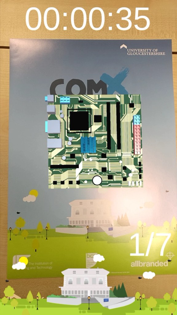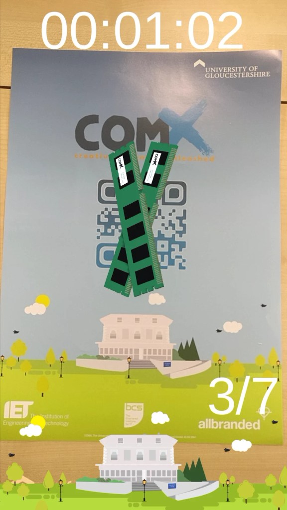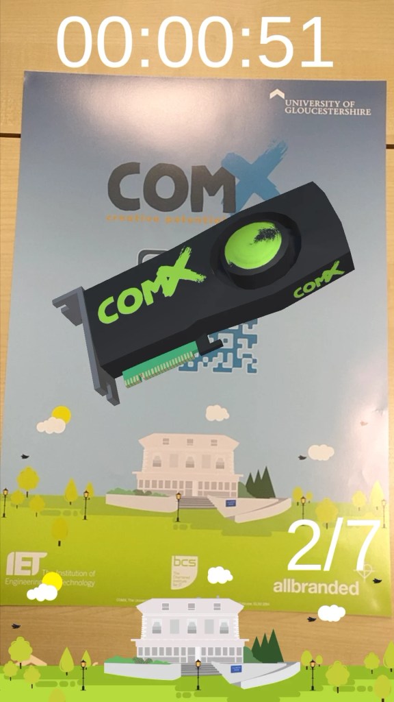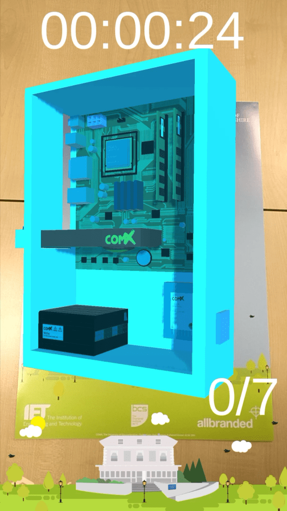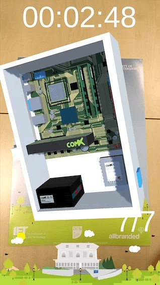 Eight 3D models and posters where created and themed around computer components and the ComX branding. Users could scan a poster to collect a part and check on their progress using the completion counter on the bottom right of their screen, or by returning to the starting poster to track their progress by visually seeing what parts they where still missing.